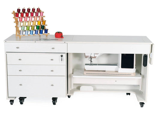 Arrow & Kangaroo sewing furniture is renowned for its stylish designs and functional features, such as electric lifts and ample storage solutions. These pieces are crafted to enhance your sewing experience by providing ergonomic workspaces and organized storage.